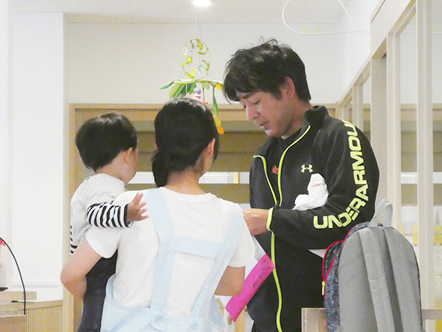 - 朝、登園したら先生やお友達に笑顔で挨拶します。